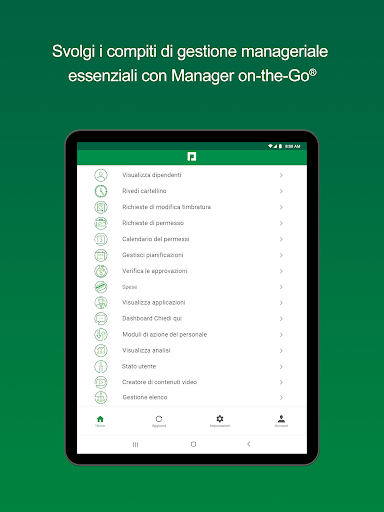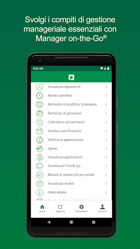 Poiché il lavoro non si ferma quando i manager non sono fuori sede, Manager on-the-Go li aiuta a sfruttare al meglio la loro giornata lavorativa. Questo strumento per dispositivi mobili consente a manager e supervisori di completare, ovunque siano, le attività di gestione essenziali che interessano i propri dipendenti, tra cui l’approvazione delle ore lavorate, le richieste di permesso e le spese, la visualizzazione degli orari dei membri del team e altro ancora.