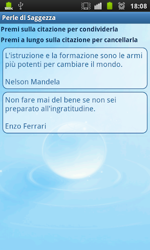 Citazioni famose, aforismi, proverbi, frasi celebri e motivazionali, presentate in maniera piacevole su diversi tipi di sfondi e con una bella melodia di sottofondo personalizzabile.