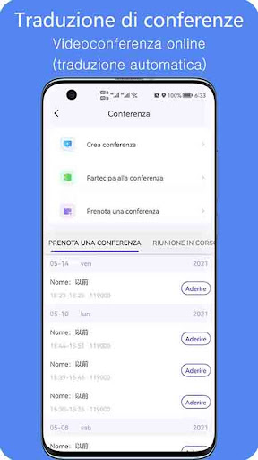 Questa APP contiene un sistema di conferenza cloud completo.Puoi tenere una conferenza multinazionale attraverso questa APP e la lingua della conferenza verrà tradotta in tempo reale.