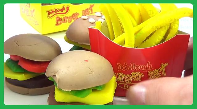 Make a pretend Breakfast & Lunch Meal & Doh Food! Doh Pizza, Burger, Hamburger, Cheeseburger, French Fries, Chicken Nuggets, Eggs, Lettuce, Vegetables, such as Tomatoes and Cucumbers, sausages, pepperoni, mushrooms, lettuce.