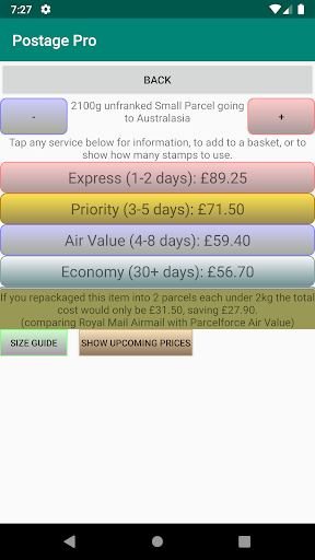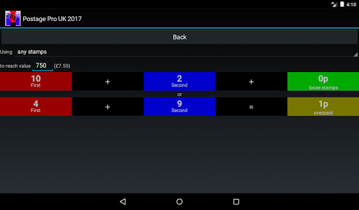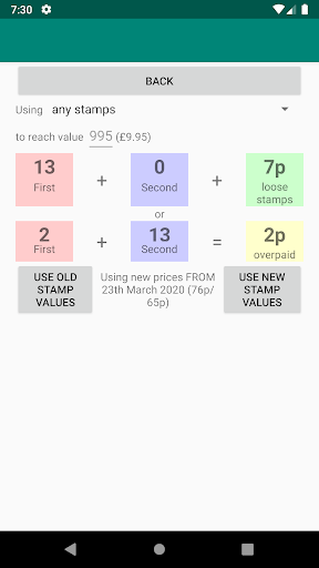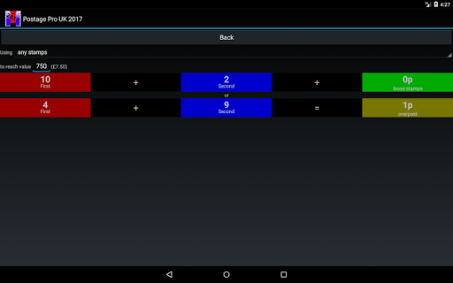 Calcolo automatico del modo più efficiente di utilizzare francobolli di classe 1a/2a (ad es. Per un pacco che costa £ 10,00, utilizzare la classe 4x1st e la classe 10x2nd)