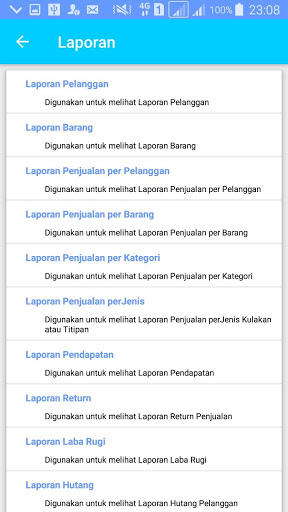 4. Laporan digunakan untuk melihat laporan barang, pelanggan, penjualan, penjualan perjenis, penjualan perpelangpan, laporan laba rugi, laporan hutang, laporan retur penjualan.