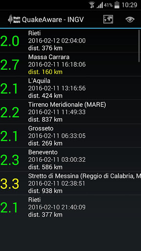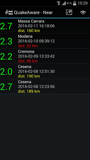 Il pulsante VICINO A ME consente di filtrare tutti i terremoti registrati nelle vicinanze (default 200 km, variabile nelle impostazioni) con tutte le principali informazioni.