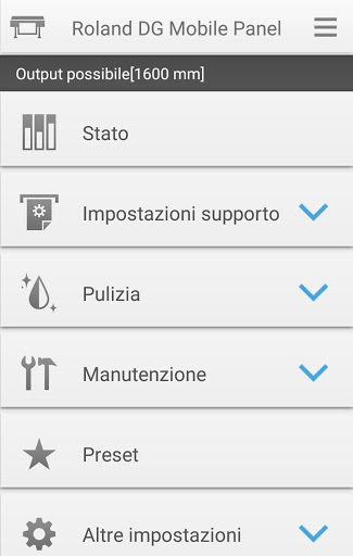 Oltre al pannello di controllo incorporato, la nuova applicazione Roland DG Mobile Panel permette di eseguire le funzioni del pannello di controllo della stampante/taglierina da un Tablet o a Smartphone tramite una connessione Bluetooth. Questa nuova funzione innovativa offre una ricca interfaccia che si rapporta direttamente o a distanza con la stampante. Ricevere aggiornamenti di stato e gestire la produzione a distanza, le stampe di prova e le funzioni di pulizia.