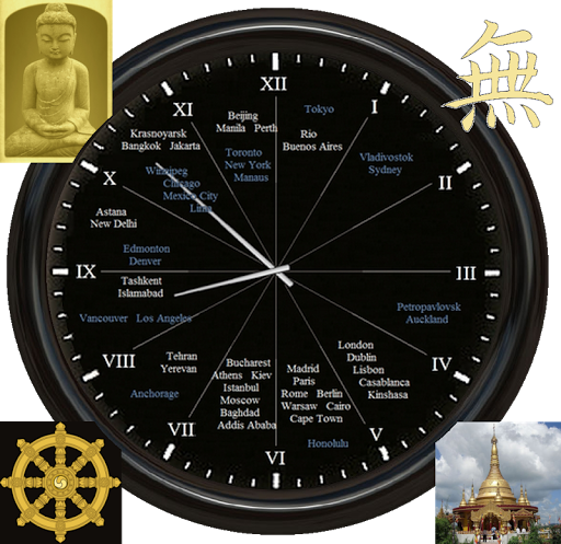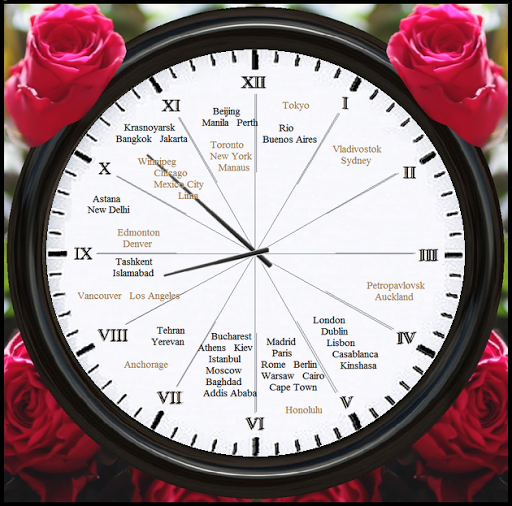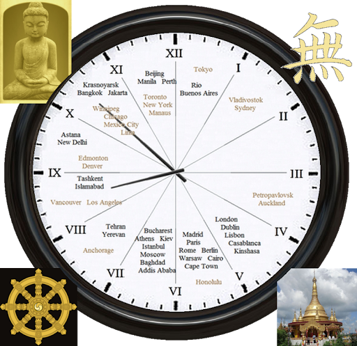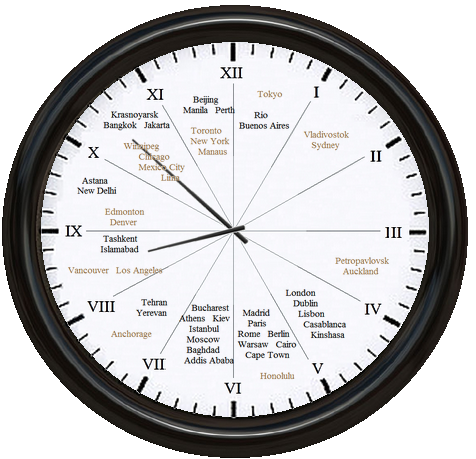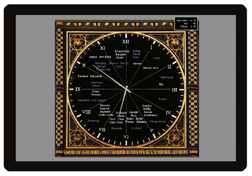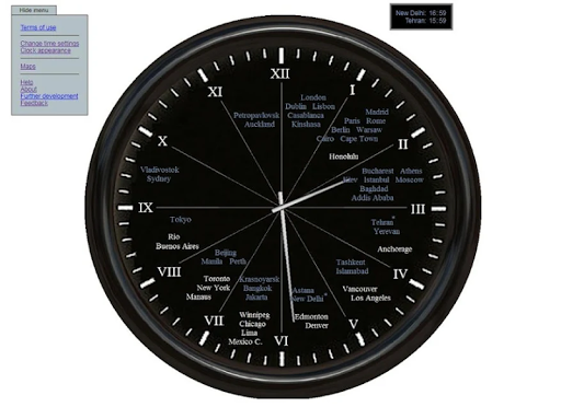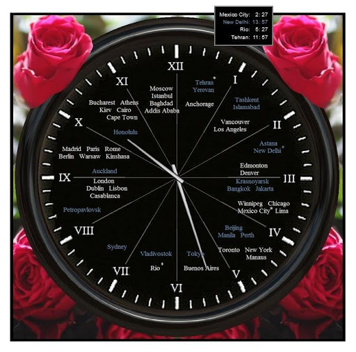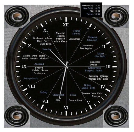 Questo è un design originale per un orologio mondiale, che presenta circa 50 nomi di città scritti su una normale (analogrica) faccia di clock di 12 ore, in base al tempo in un dato momento . Quando l'ora cambia, la posizione delle città all'orologio cambia di conseguenza. Pertanto, la posizione della faccia dell'orologio dà il tempo per ogni città. Per distinguere tra AM e tempo PM, viene utilizzata una semplice combinazione di colori.