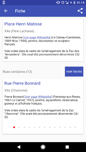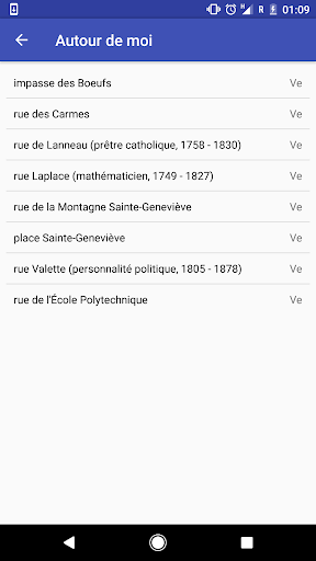 Questa applicazione contiene una base di oltre 5000 strade e tracce parigini.Hai anche l'opportunità di accedere facilmente alla storia delle strade intorno a te in un dato momento.