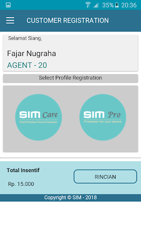 SIM Agent adalah sebuah platform aplikasi dimana semua orang dapat menjadi marketing online dan mendapatkan insentif hanya dengan merekomendasikan calon customer untuk memperbaiki ponsel/notebook mereka di SIM Care, mendaftarkan ponsel mereka dengan proteksi ponsel SIMPro dan membeli produk di SIM Store.