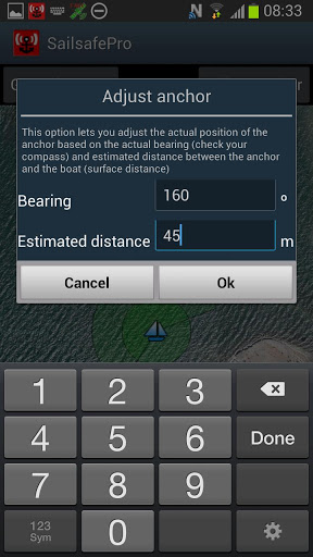 - Una volta l'allarme È impostato, è possibile regolare la posizione dell'ancora nel caso in cui non sia corretto. Basta indicare il cuscinetto reale (leggilo dalla bussola) e la distanza stimata tra la nave e l'ancoraggio (distanza superficiale).