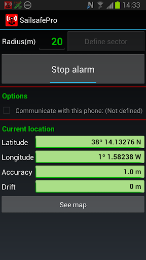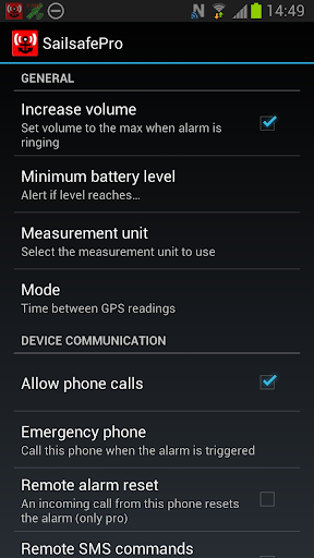 SailsaSfe è stato progettato per massimizzare la sicurezza dopo l'ancoraggio. Pertanto, una volta attivato l'allarme, non solo la posizione della nave viene controllata, ma anche il livello della batteria nel dispositivo mobile o lo stato del segnale GPS. Se uno qualsiasi di questi parametri non riesce, l'app produrrà un allarme udibile per informare sul problema specifico. Quindi, dopo aver impostato l'allarme puoi rilassarti e fidarsi di SailsaSfe. Guarderà per te.