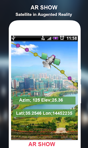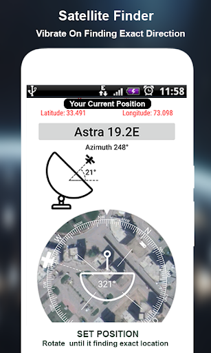 ⦁ È possibile impostare un satellite da bussola, mappa e fotocamera (vista AR). Otterrai anche l'azimut del tuo satellite selezionato con latitudine e longitudine calcolata per la tua posizione.