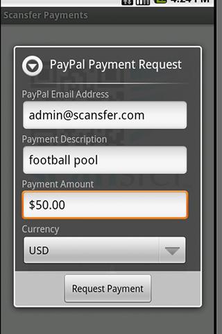 Accept PayPay Payments from your phone quickly and easily.Scansfer Payments allows you to quickly and easily generate PayPal Payment request bar codes on your phone. To collect the money, you simply have the person paying you scan the bar code on your screen using ANY QR bar code scanner from ANY type of smart phone the person paying doesn39;t need to have the app installed. All of the payment information including your paypal account, the amount and a brief description, are encoded in the bar code. After the bar code is scanned, the user is instantly taken to a PayPal checkout page to complete the transaction.What is it good for? Here are some examples:1.Suppose you are having a yard sale or selling something on Craigslist, and the person shows up to buy something, but they dont have enough cash. You can ask them if they have a PayPal account, and if they say yes, have them scan your phone to send you the money.2.Say you have an office pool or coffee club, and you need to collect money from everyone. Just enter the information into the Scansfer Payments app and then go around the office having everyone scan your phone.3.Imagine if you were having a fundraiser for a charity or a special group Visit http:scansfer.com and generate PayPal Payment QR codes for offline publishing. Print the QR codes on flyers and posters, and you can collect donations from people on the streets or anywhere by having them scan the bar codes with their phones.What do you need to use it?1. Both parties must have a PayPal account2. Both parties must have an Internet connection to use 3g4g or wifi 3. The person requesting Payment needs to have Scansfer Payments or regular Scansfer, the person paying needs to have a bar code scannerWhat39;s the difference between Scansfer and Scansfer Payments?Scansfer Payments is a lite version of the full Scansfer app for users who are primarily interested in the Payments feature. For more features, see regular Scansfer.Visit our website http:scansfer.com for more information or to generate offline QR codes