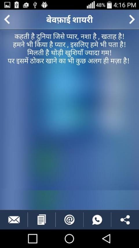 Sher Shayari application gives you wonderful Shayari collection with different categories like love, dosti, sad, bewfa, festival sms, different categories status or more. Sher Shayari application also provides Multilanguage’s Shayari.