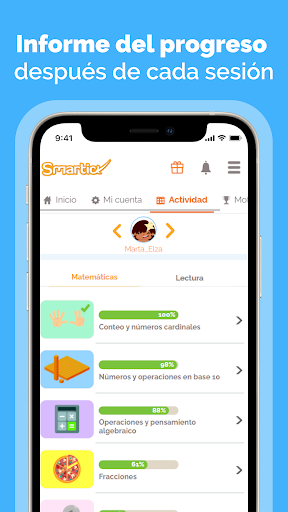 ayúdal per essere bambini matematici con una buona comprensione della lettura con il nostro programma personalizzato.Il metodo Smartick progetta un curriculum personalizzato al ritmo e alla capacità di ciascuno.Solo 15 minuti al giorno e alla fine, giochi educativi per i bambini per allenare la memoria, la concentrazione e l'attenzione. Per intelligenza artificiale aiutano i bambini a comprendere la matematica in un modo che si adatta alle loro esigenze di apprendimento.Anche in inglese.Contenuto disponibile per bambini di 3 anni e bambini di età pari o superiore a 4 anni.