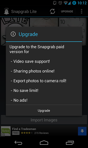 **SAVE AND SHARE SNAPCHAT PICTURES AND VIDEOS****THE ORIGINAL APP, DON'T SETTLE FOR OTHER LOW QUALITY COPY APPS****Please do not download if you do not have a rooted phone, it will NOT work.****If the application is not copying images then please install BusyBox**Ever wished those Snapchat messages you got didn't have a time limit?Friend sent you an awesome photo you wanted to save but couldn't?Well Snapgrab Lite is the answer!Snapgrab Lite is able to locate and save snapchat photos without time limits or notifications to your friends in just a few simple steps. 1. Open Snapchat and click on the box icon in the bottom left.2. Let any snapchat images download, there should be a closed pink box icon and it should say 'Press and hold to view' next to it3. Don't open the image.4. Close Snapchat and open Snapgrab.The image should say 'Press and hold to view'. If it says 'Tap to load' then press it once.Upgrade to the full application for extra features such as:- Video save support!- Sharing photos online!- Export photos to camera roll!- No save limit!- No ads!facebook http://facebook.com/snapgrabapptwitter http://twitter.com/snapgrabappPlease email me at rb00166@gmail com if you have any issues with the application before leaving a review and I will help sort things out!This software is provided "as is" and may not always offer its advertised functionality in future as it is dependent on the Snapchat application keeping images unencrypted.The 'Snapchat' application as a whole and all rights, titles, and interests in and to the application are owned by the Snapchat, Inc. This application is in no way affiliated with the Snapchat, Inc.