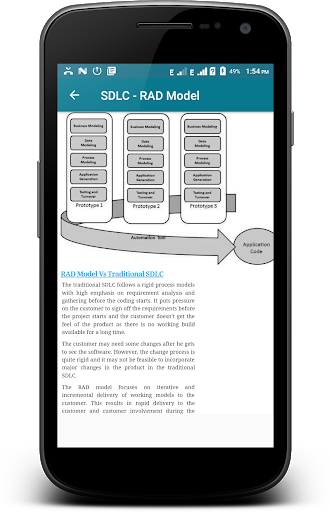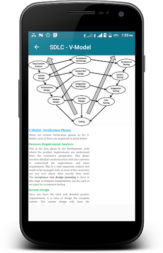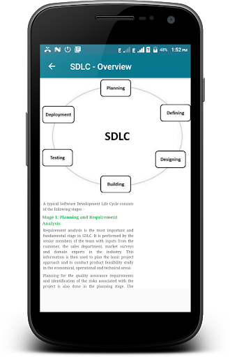 ❰❰ Questa app è rilevante per tutti quei professionisti che contribuiscono in qualsiasi modo per lo sviluppo del prodotto software e il suo rilascio. È un utile riferimento per le parti interessate di qualità di un progetto software e dei programmi / dei project manager. Entro la fine di questa app, i lettori sviluppano una comprensione completa di SDLC e dei suoi concetti correlati e sarà in grado di selezionare e seguire il modello giusto per un determinato progetto software.❱❱
