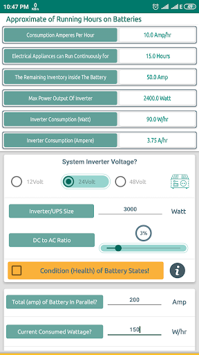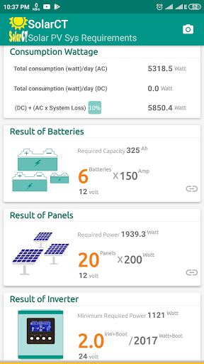 SolarCT è un calcolatore di app per i requisiti dei componenti del sistema solare come il numero di pannelli solari e batterie necessari, le dimensioni dell'inverter / UPS e del caricatore del controller e come collegare i pannelli solari e le batterie in serie e in parallelo a seconda della tensione del sistema / inverter.