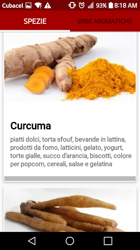 Spezie, erbe e loro usi culinari è un'applicazione GRATUITA disponibile per Android che contiene un'ampia varietà di spezie , la loro descrizione e i loro usi culinari secondo ai tipi di alimenti.