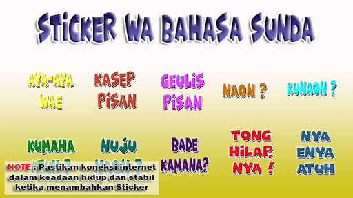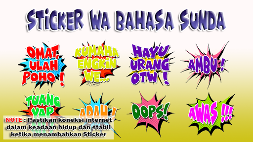 Adesivo WA Sundanese è una collezione di adesivi di chat della lingua solare. Tutti loro consistono in due parti e consistono in 90 adesivi fantastici e certamente unici. Tutto è in Sundanese.