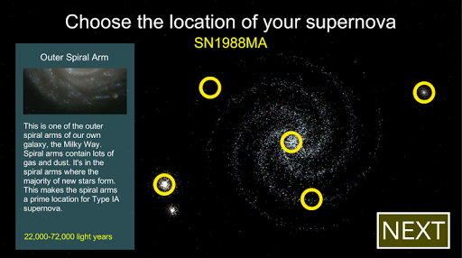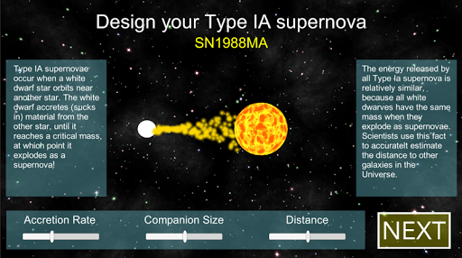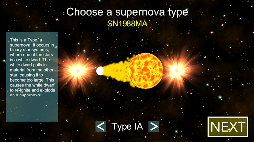 Crea la tua supernova, scegliendo quanto sia grande, che tipo di supernova è e altre proprietà.Quindi, osservalo esplodere e scoprire quanto fosse potente la tua supernova.Puoi creare una supernova che potrebbe distruggere la Terra?Gioca con l'app per scoprirlo!