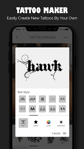 Tattoo Design Maker is a tool for making tattoo which gives you facility of tattoo editor with different tattoo fonts, art tattoos, meaningful tattoos, name tattoos, beautiful tattoos, name tattoo designs, English tattoos, butterfly tattoos, text tattoos, dragon tattoos, etc. best application to design tattoo as you love.