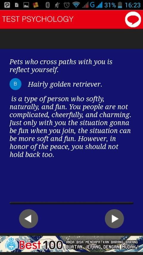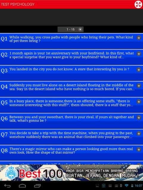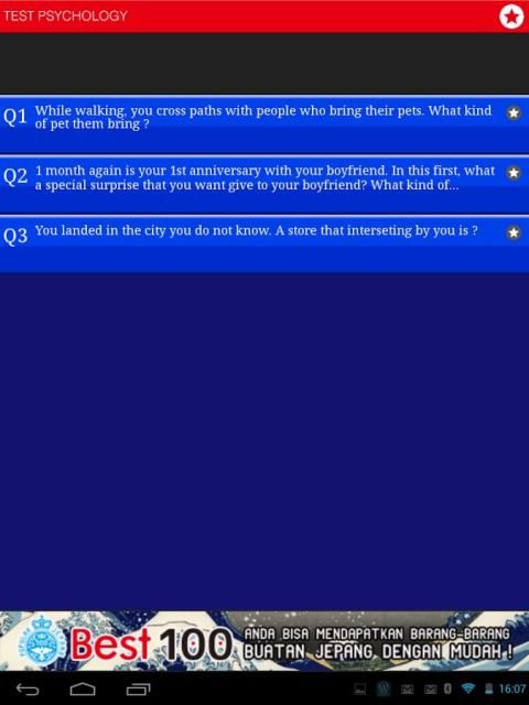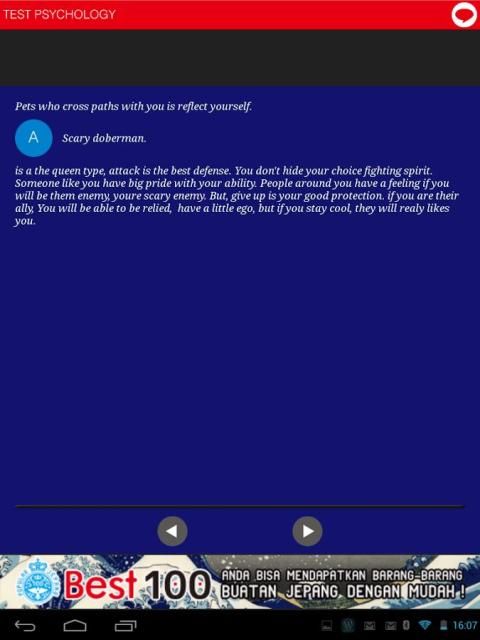 * You can enjoy this application for free. You might be able to find something surprising that has not you know, if you tell a friend or your boyfriend to answer the questions in this test. Because this is a simple psychological test that can be answered by intuition.