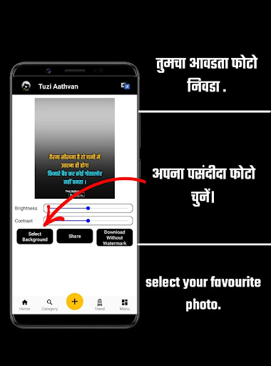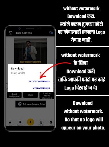 Ora puoi modificare la tua foto con un clic singolo con Tuzi Aathvan Hindi e Marathi Status.La modifica dello stato PNG è molto semplice.La modifica dello stato PNG è disponibile nell'app gratuitamente.