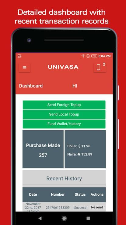 With UNIVASA App, you can top-up your mobile phone on any network across the globe, send airtime to multiple phone numbers at once, fund your UNIVASA wallets and manipulate your UNIVASA account without having to go to the web browser.