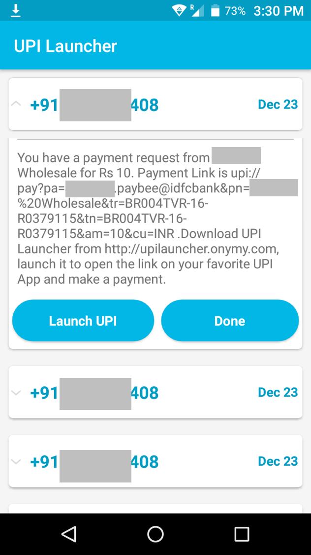 * User can review all messages with UPI Links and launch a UPI App at any time.