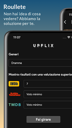 La modalità Roulette ti aiuta a scegliere film e serie su Netflix quando non sai cosa guardare. Basta impostare i tuoi filtri in base a categorie, punteggi IMDB, TMDB e Rotten Tomatoes e Upflix suggerirà qualcosa di tuo gradimento.