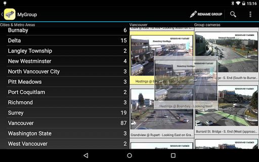 Create your own groups of favorite cameras for easy access. Search locations, add them to your list of favorite places, and see cameras around.