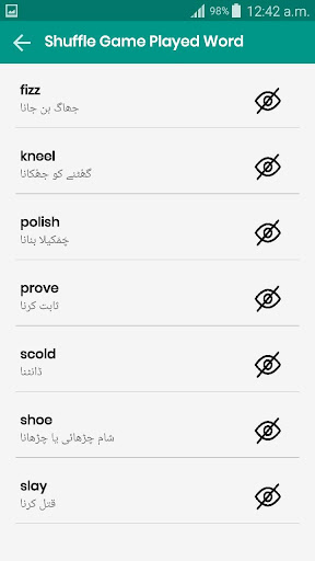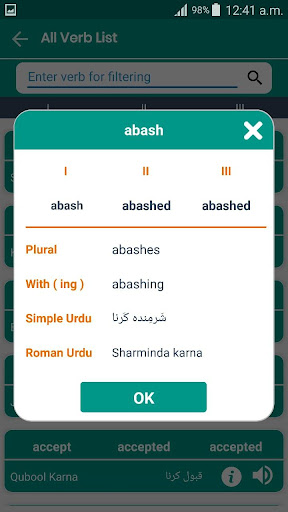 Verbi Master Spelling Game ti fornisce verbi inglesi a significati urdu e hindi con tre forme, nonché forma e forma plurale con pronuncia.Fai clic sull'icona dell'altoparlante per la pronuncia.Fornire anche maggiori dettagli dei verbi facendo clic sull'icona del pulsante Dettagli per ciascun verbo.e scheda su ogni forma di verbo per la pronuncia nel dialogo delle informazioni.Quindi usa sempre le opzioni di pronuncia per migliorare il tuo parlare e ascoltare l'inglese.