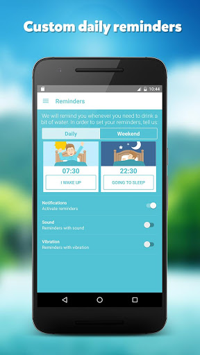 Il prossimo passo sara’ quello di scegliere in che modo vuoi che ti ricordiamo il tuo consumo di acqua, ci dovrai indicare la ora in cui abitualmente ti svegli e l’ora in cui vai a letto. Tra queste ore il nostro sistema ti andra’ ricordando ( con notifiche personalizzate, visuali, sonore, vibrazioni) di bere un bicchiere d’acqua.