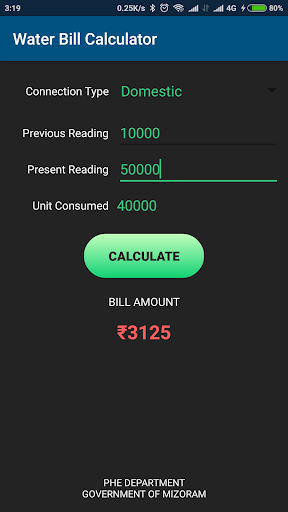 The department developed a mathematical formula to calculate water bill. The formula calculates the bill amount by taking connection type and quantity of unit consumed as the input. The same formula is adopted and implemented in this app.