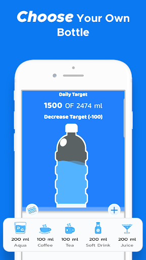 in your pocket! Drink reminder reassures that you follow recommended water intake level regularly. It records daily water intake and other fluids. Grab a bottle and click on me!