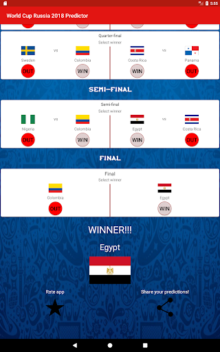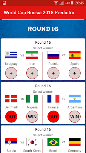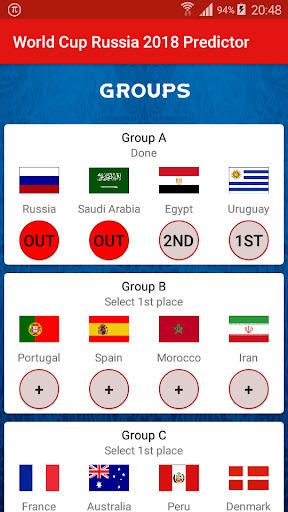 First select group stage 1st and 2nd places, then select round 16, quarter-final,semifinal winners and then you only need to select world cup winner! Later on you can share your predictions!