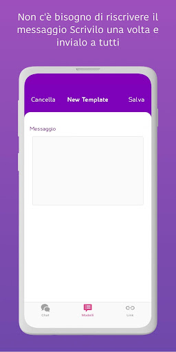 • Salvare messaggi modello che usi frequentemente su WhatsApp. Salvali su WtsAppy come note che puoi condividere su WhatsApp in qualsiasi momento con un click. Sì, solo un CLICK! I modelli possono essere il tuo indirizzo, la tua posizione o il tuo conto bancario.