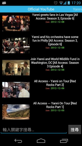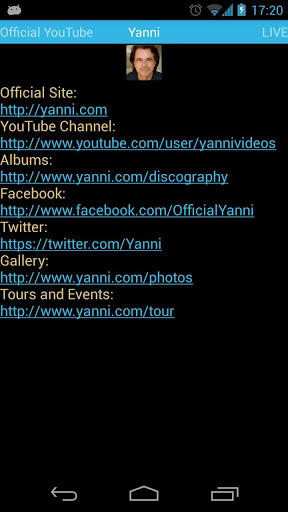 This app brings you pure Yanni Music and live concert videos!This year has been a busy one for Yanni and his world renowned orchestra, selling out major concert venues around the world including Eastern Europe, the Middle East and Asia. With his world-class orchestra, he performed music from his latest album, "Truth of Touch," now platinum in the Middle East, as well as classic concert favorites.Yanni is continuing to tour, so visit: Yanni.com/tour for additional information.Enjoy videos from the road and travel the world with Yanni right here on You Tube by watching All Access: Yanni on Tour!Great features include:- Unlimited Video List (realtime updates).- Swipe to Switch Video Tabs.- Click to play - Completely free Thanks for downloading, please leave a comment and/or positive rating if you like Yanni Tube.This is an un-official app!Copyright of the content is respectful reserved for the makers of Yanni. This is a 100% fan-made based app. ALL RIGHTS MAINTAINED RESPECTFUL TO THE OWNER.Keywords: Yanni, Yanni piano sheet music, piano artist, piano solos, grand piano, Rainmaker, World Dance, Reflections of Passion, Playing By Heart, A Walk In The Rain, Nostalgia, "In the Mirror", The Rain Must Fall, "Until the Last Moment", True Nature, New Age, World Music, New Age Music, Yanni YouTube Channel, Yanni YouTube playlist.