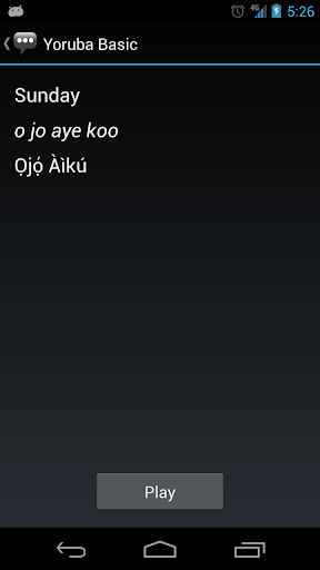 3. Nella pagina frase dettaglio, la frase yoruba è mostrato a fianco la pronuncia e l'equivalente frase inglese. Premere il pulsante Play per ascoltare la pronuncia audio da un madrelingua.