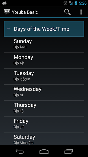 Utilizzando questa applicazione, è possibile selezionare una frase inglese e visualizzare la sua traduzione e come si pronuncia in Yoruba.
