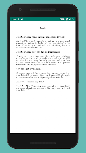 : Ogni nota nel tuo diario è crittografata con una chiave di identificazione sociale che non è immagazzinato con sviluppatori. Il documento è decrittografato solo al telefono dell'utente dopo il login. Quindi, anche lo sviluppatore non può leggere i tuoi documenti. È possibile archiviare saldamente le password o qualsiasi informazione personale nel tuo diario.