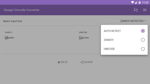 - Abilitàper convertire Zawgyi o Unicode da qualsiasi menu Condividi app.
