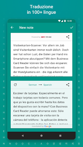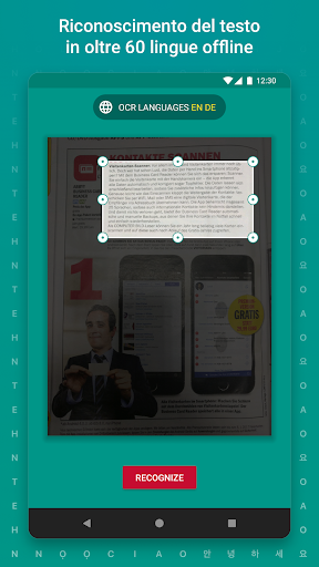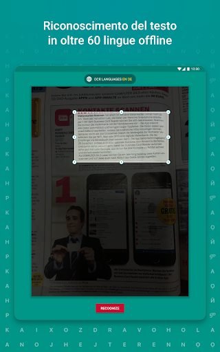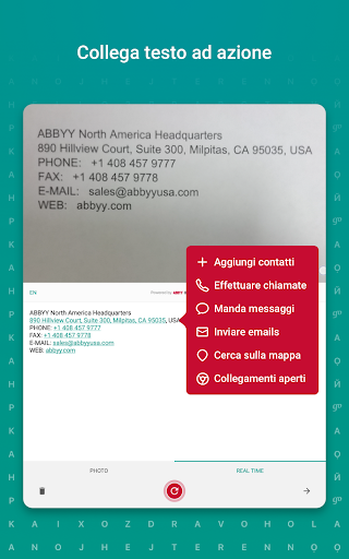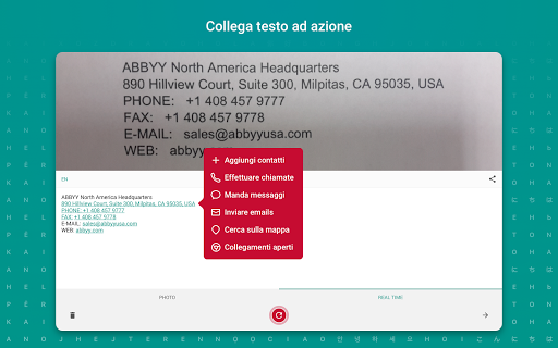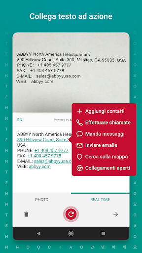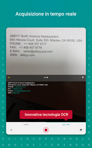 - La modalità di riconoscimento in tempo reale (Real-Time Recognition) basata sulla tecnologia ABBYY RTR SDK digitalizzerà il testo stampato direttamente sulla schermata della fotocamera. Dopo la digitalizzazione, tutti i link, numeri di telefono, indirizzi e-mail diventeranno cliccabili: potrai cliccare su un link, un numero di telefono o e-mail.