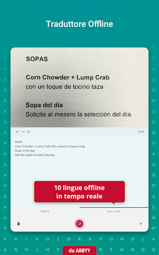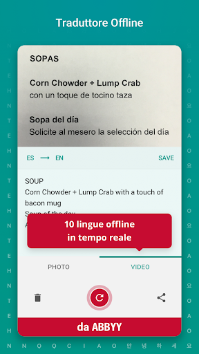 - Traduzione in tempo reale direttamente sullo schermo della fotocamera senza scattare foto in oltre 100 lingue online (traduzione di testi integrali) e 10 lingue offline (traduzione parola per parola).
