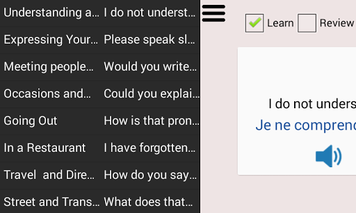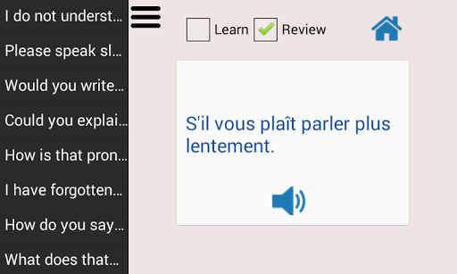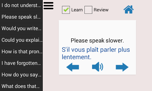 Impara la lingua francese ti consente di imparare la lingua francese con il tuo dispositivo in qualsiasi luogo che potresti leggere le frasi, ascoltare e ripetere.Pratica ovunque tu vada, un'app utile per turisti e uomini d'affari che viaggiano in Francia, Svizzera, Canada, Belgio e molti altri paesi parlanti francesi o altrove.Impara le abilità di conversazione francese di base, imparano il vocabolario francese con parole generali e frasi di conversazione, voce registrata da altoparlanti francesi nativi che puoi esercitare per testare ciò che hai imparato.Integrated Alphabet Writing Helper e immagini visive con la pratica.