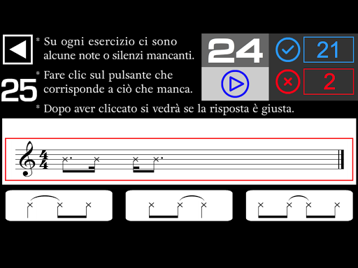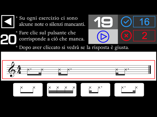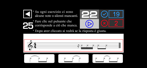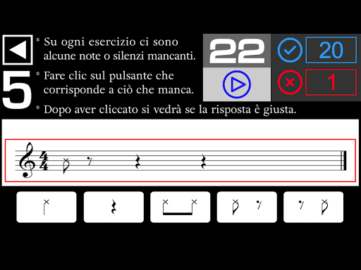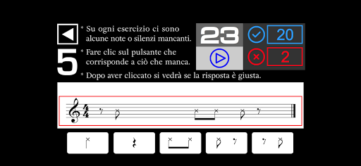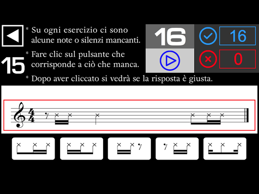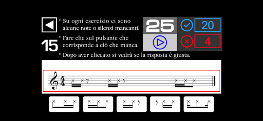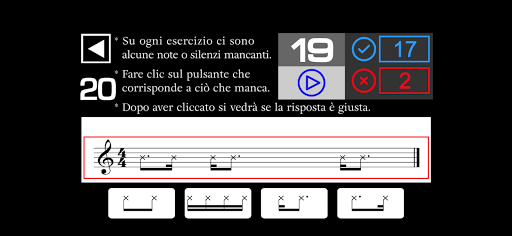 - Su ogni esercizio ci sono alcune note o silenzi mancanti. Devi ascoltare e cliccare sul pulsante che corrisponde a ciò che manca.