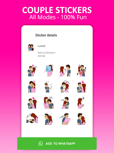 Ti offriamo un'enorme e incredibile varietà di nuovi adesivi Amore per Whatsapp, puoi selezionare qualsiasi adesivo in base al tuo umore e divertirti La chat con i tuoi cari. Hai solo bisogno di fare un clic per scaricare questi adesivi gratuiti Whatsapp sul tuo telefono. Scarica questi adesivi WhatsApp e goditi la tua chat con i tuoi amici. È davvero divertente chattare tramite adesivi anziché semplici messaggi. Ti presentiamo un'enorme collezione di adesivi carini e romantici. Puoi facilmente scaricare questi adesivi e aggiungerli al tuo whatsapp. Per chattare attraverso gli adesivi è in trending al giorno d'oggi ed è anche una cosa divertente da fare. Puoi facilmente mostrare il tuo sentimento verso un altro attraverso questi nuovi adesivi d'amore per WhatsApp.