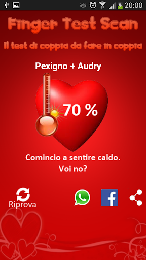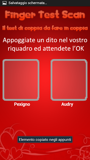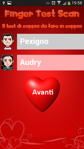 Il test va svolto in coppia. E' sufficente inserire i propri nomi, appoggiare un dito insieme nell'apposito box e l'applicazione restituirà un risultato con una percentuale di affinità di coppia.