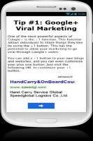 Is your business benefiting from Google Plus (Google +) yet? Now is your chance! Discover how you can get tons of free targeted traffic and massive exposure for your business to INSTANTLY increase your profits through Google plus marketing tips. If you are not harnessing the power of Google +, you are leaving cash on the table. With Google+, gaining exposure and building your brand is easier than ever. Download this FREE app now and discover: - How to create and set up your Google+ profile for maximum exposure. - How to setup your Circles, add boat loads of people to them and market your products. - How to use Google+ Steaming to benefit your business. - How to effectively use Google+ Hangouts to gain exposure and build your brand. - How to take advantage of Google+ Sparks and "Whats Hot" to skyrocket your business. - How to use Huddler and Messenger to build relationships quickly for good business. - Discover what is GGL PLs and how to use it to your advantage. - How to easily promote things on Google+ and which Widgets to use to do this quickly. So, this is your chance to learn and implement right after you learn the tricks and tactics from this Google Plus Marketing FREE app!