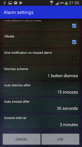 Same as Time and Location, however this alarm is based on a wifi-network instead of a location. When the alarm time is reached, the network is checked before the alarm sounds.