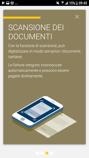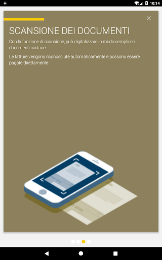 «Scansione documenti» per fotografare e archiviare contemporaneamente i documenti. La funzione consente di riconoscere automaticamente le polizze di versamento e di estrapolarne i dati di pagamento, per poter trasmettere direttamente un ordine di pagamento alla banca.